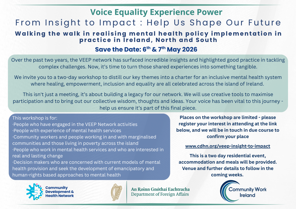 We invite you to a two-day workshop to distill our key themes into a charter for an inclusive mental health system where healing, empowerment, inclusion and equality are all celebrated across the island of Ireland.